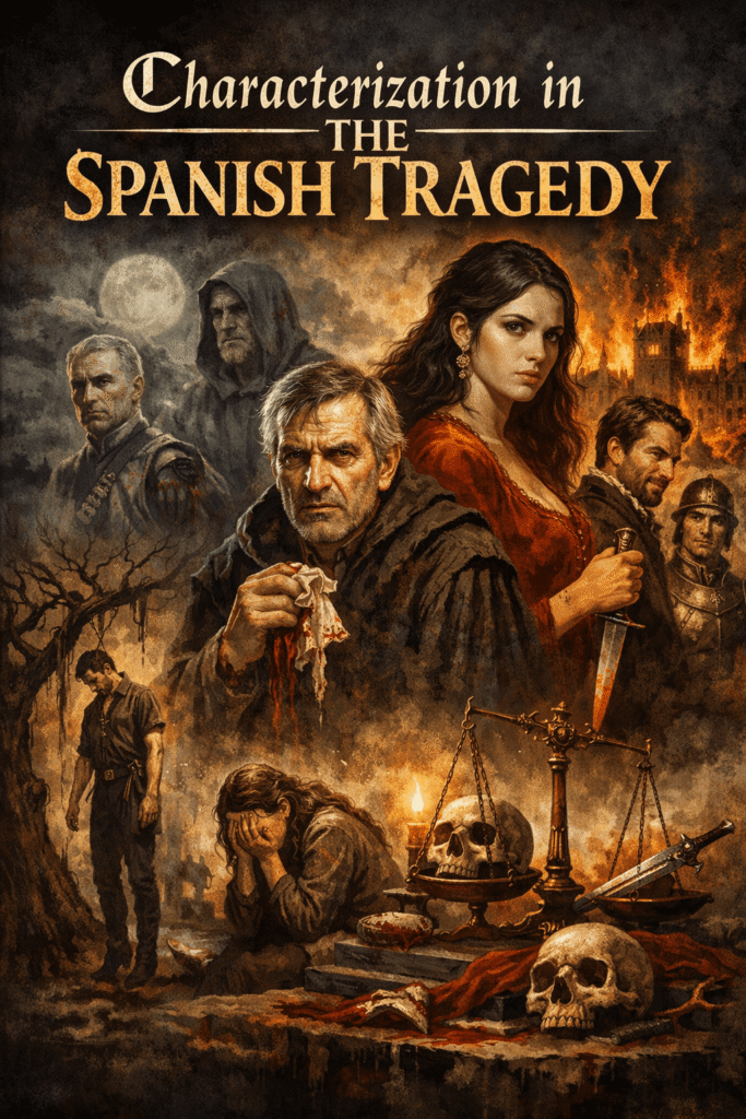 Revenge tragedy forms the central dramatic structure here. First, revenge motivates characters after severe injustice occurs. Consequently, grief transforms ordinary individuals into determined avengers. Moreover, emotional suffering encourages dangerous decisions. Therefore, characters abandon patience and seek violent justice. Furthermore, tragic revenge destroys victims and avengers alike. Meanwhile, Hieronimo struggles between legal justice and revenge. Likewise, Bel-Imperia demands justice for Horatio’s brutal murder. Thus, emotional pain guides their actions strongly. However, revenge also produces moral confusion. Instead, justice becomes difficult to achieve peacefully. Consequently, characters face hesitation and internal conflict. Additionally, dramatic speeches express anger and despair. Similarly, grief shapes every step toward revenge. Therefore, emotional intensity drives the tragic narrative forward. Furthermore, violent outcomes reveal revenge’s destructive power. Thus, Characterization in The Spanish Tragedy strengthens revenge tragedy traditions.